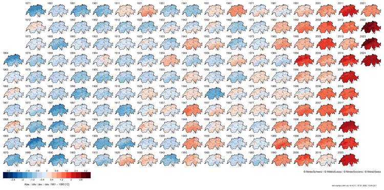 Die Schweiz verfügt über ein Beobachtungsnetz, das die Entwicklung des Klimas seit vielen Jahrzehnten aufzeichnet. MeteoSchweiz hat die Temperatur- und Niederschlagsmessungen der Vergangenheit ausgewertet. Sie illustrieren eindrücklich die Temperaturänderungen.